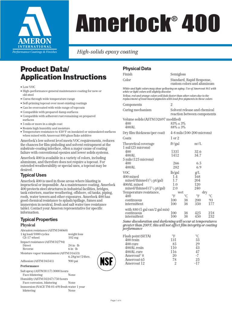 Amerlock®400bf productdatasheet september16,2020(revisionofmay2,2018) ref.p099 page1/5 description. Amerlock 2 is ansi/nsf 61 (potable water) approved for immersion in tanks, pipes, valves and fittings. Amerlock2 is compliant with usda. Amerlock 400 is used in those areas where blasting is impractical or impossible. As a maintenance coating, amerlock 400 protects.