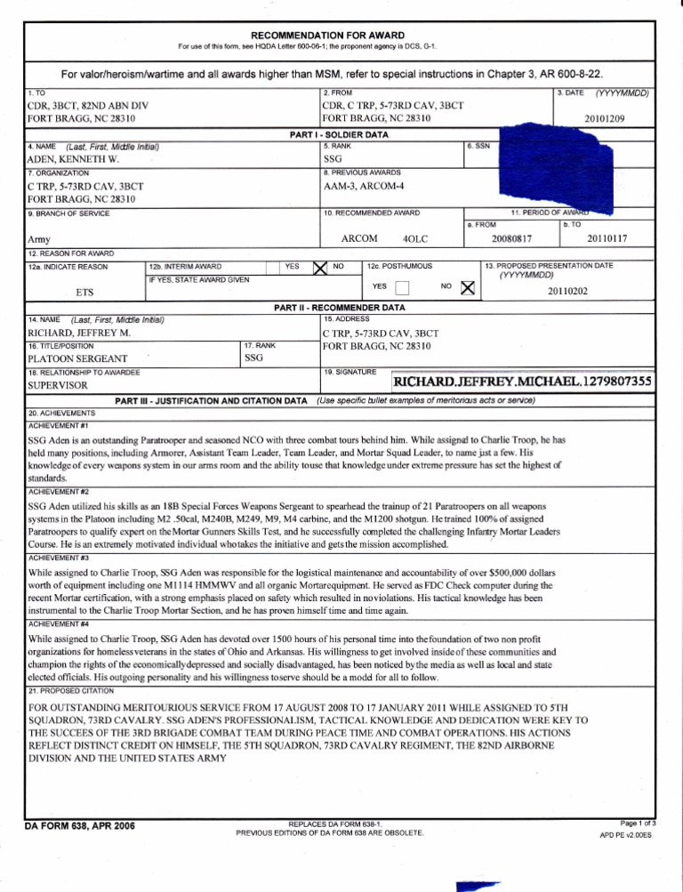 Ken Aden Military Award PDF Staff Sergeant Military Of The United