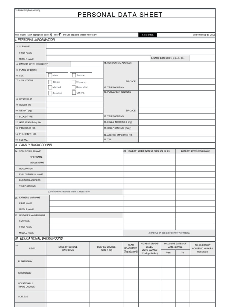 The form contains personal information, family. Dear visitor, thank you for. Personal data sheet is a crucial document in the job application process for positions under the civil service commission. Download and fill out the pdf form for civil service eligibility and work experience. Learn how to complete the personal data sheet (pds) for civil service employees in the philippines.