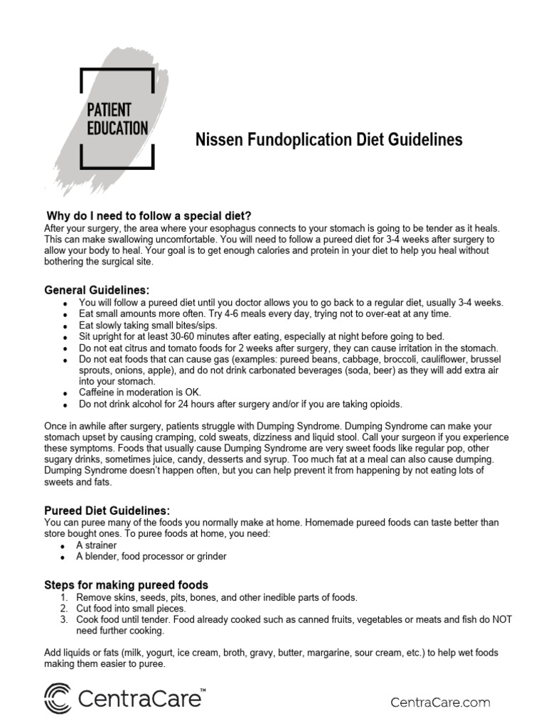It may take a month or more for swallowing to feel. Weeks 1 & 2 following surgery this phase of your diet consists of foods that are liquid, liquefy. Diet after hiatal hernia repair / nissen fundoplication surgery this information is for patients who have recently had nissen. Full liquid & soft diet phase 1 full liquid/ pureed foods: When.