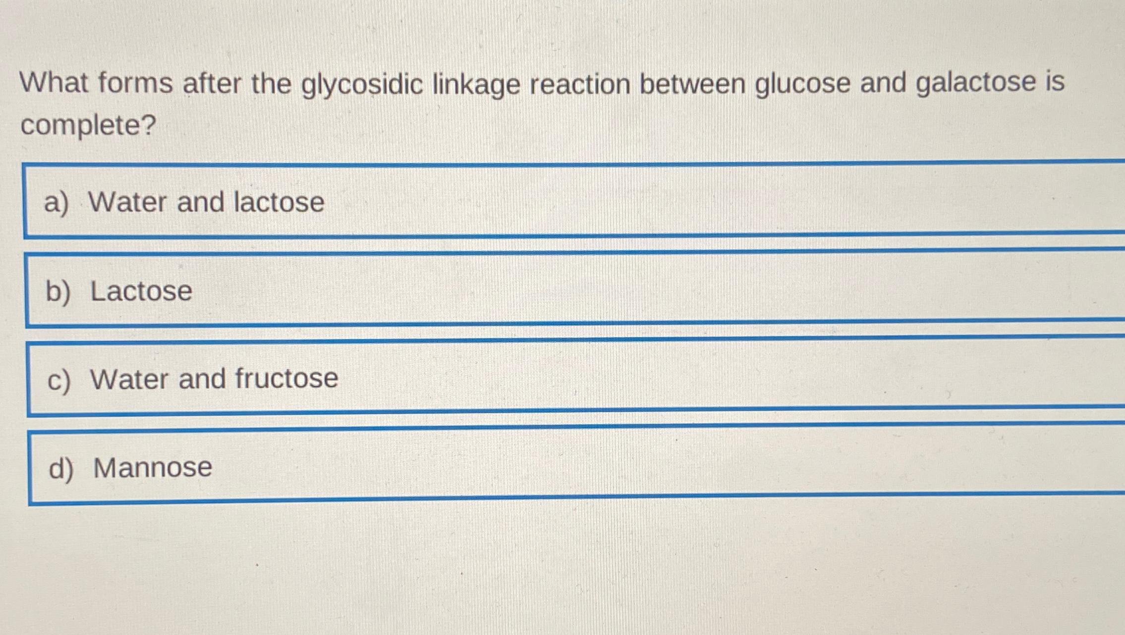What forms after the glycosidic linkage reaction between glucose and galactose is complete? What forms after the glycosidic linkage reaction between glucose and galactose is complete? What forms after the glycosidic linkage reaction between glucose and galactose is complete?