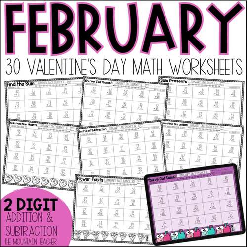 Valentine's Day 2 Digit Addition and Subtraction Worksheets Math